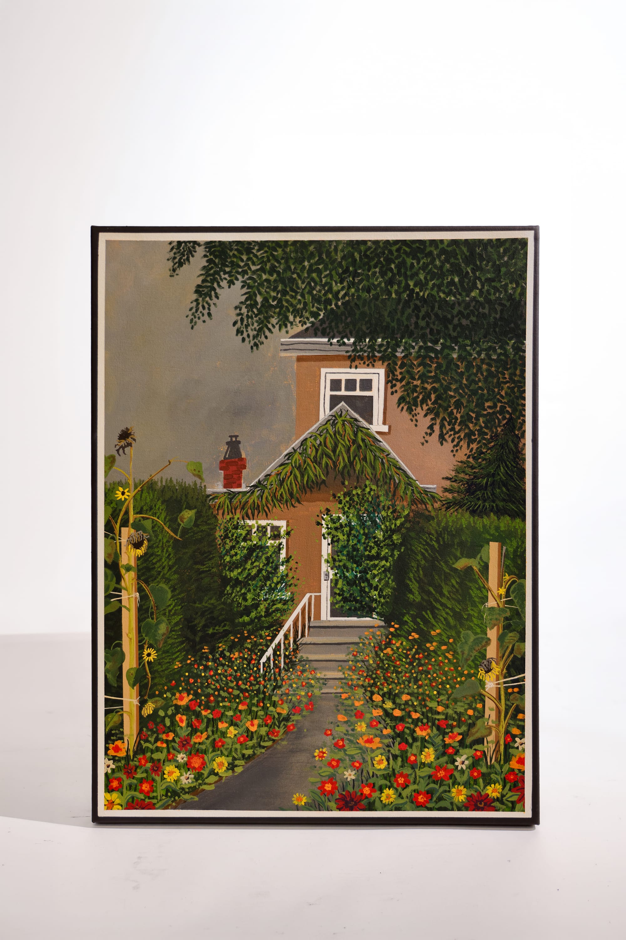 The painting shows a cozy Vancouver‑style house hidden behind an overgrown, vibrant garden. Bright flowers, tangled greenery, and climbing vines take centre stage, giving the scene a moody, lived‑in feeling. The more you look, the more the garden reveals, hinting at the gardener and their love of a garden.